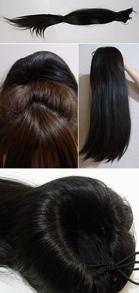自毛をゴムでまとめて、お団子状にまとめて、その上からかぶせて使うタイプのつけ毛です。